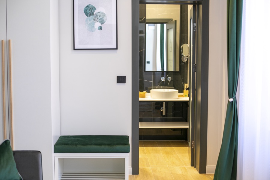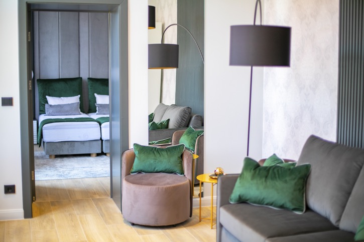 Cu o suprafață de 43 de metri pătrați, camera vă oferă o oază de lux în centrul Careiului! Apartamentul dispune de un dormitor cu living dotat cu canapea extensibilă premium pentru două persoane. Datorită distribuției celor două încăperi este optim chiar și pentru cazarea a două familii. Datorită suprafeţei sale generoase, facilităţilor moderne multimedia, dotării cu canapea, respectiv o măsuță cu două fotolii premium este o alegere optimă pentru un sejur de vis. Apartamentul este dotat cu dulap cu seif, umbrelă, minibar, espressor și fierbător de apă.